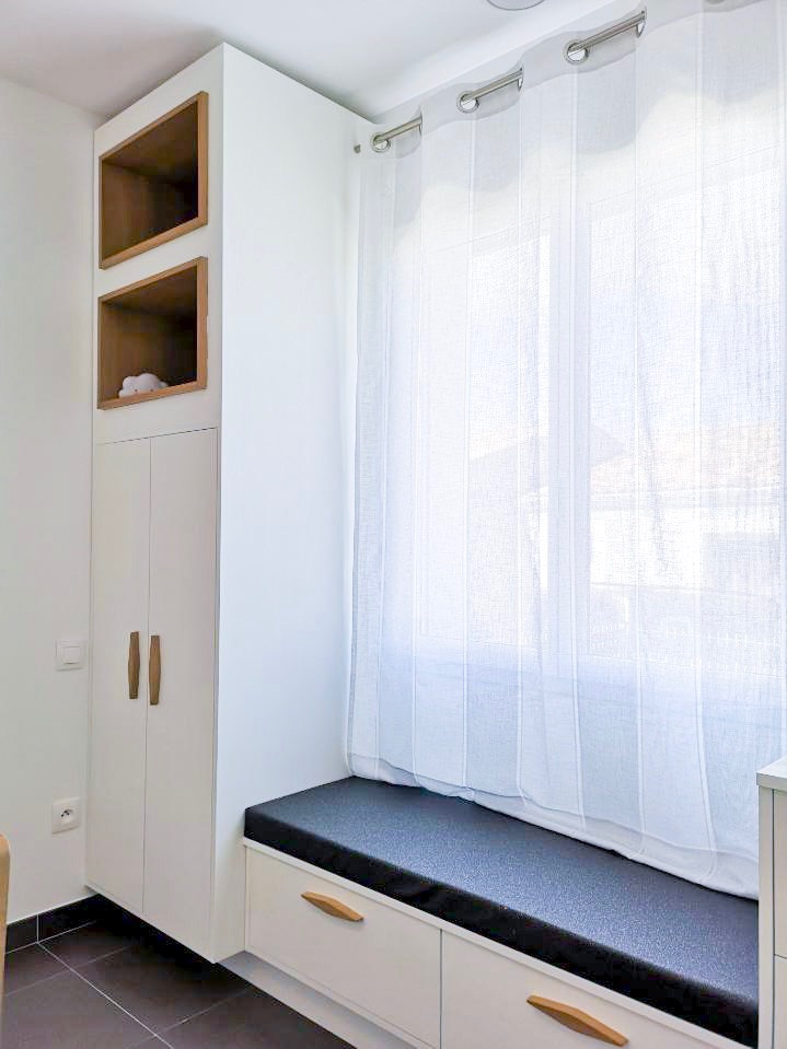 Enfin Le dressing, lumineux et discret réalisé sur mesure avec banquette et rangements pour utiliser l’espace intelligemment. Chêne naturel et chêne peint en blanc.