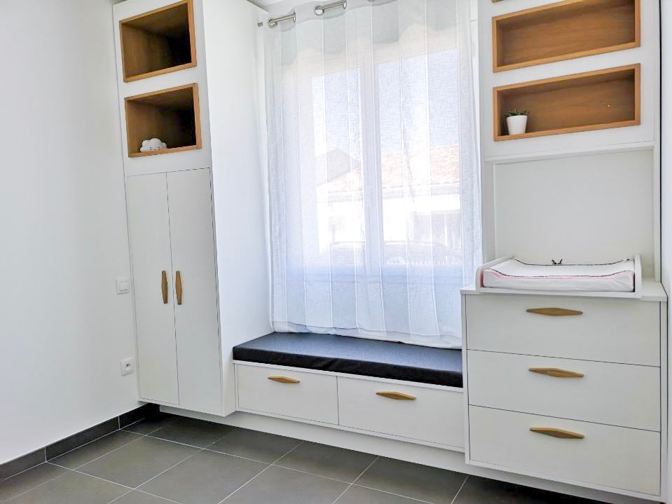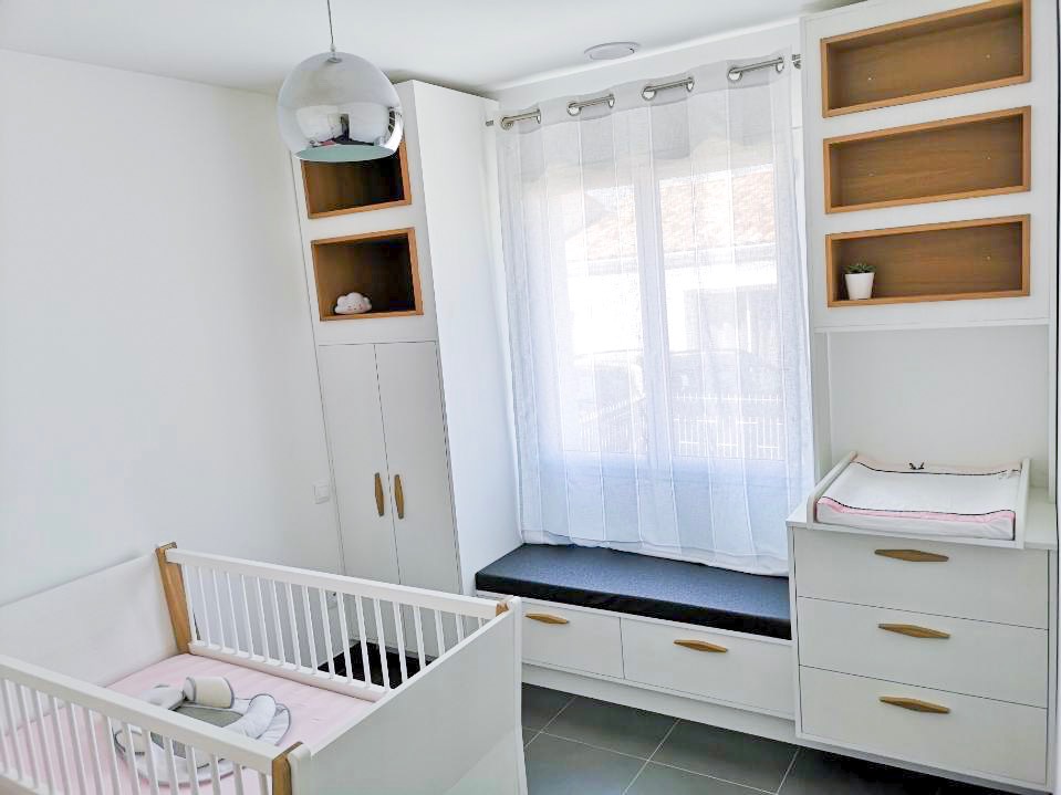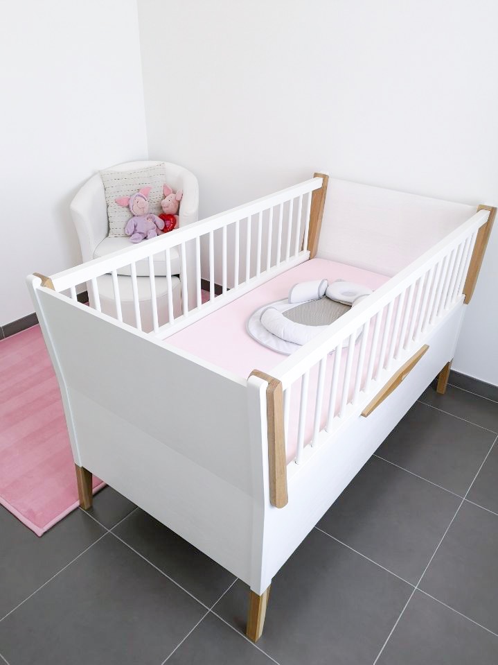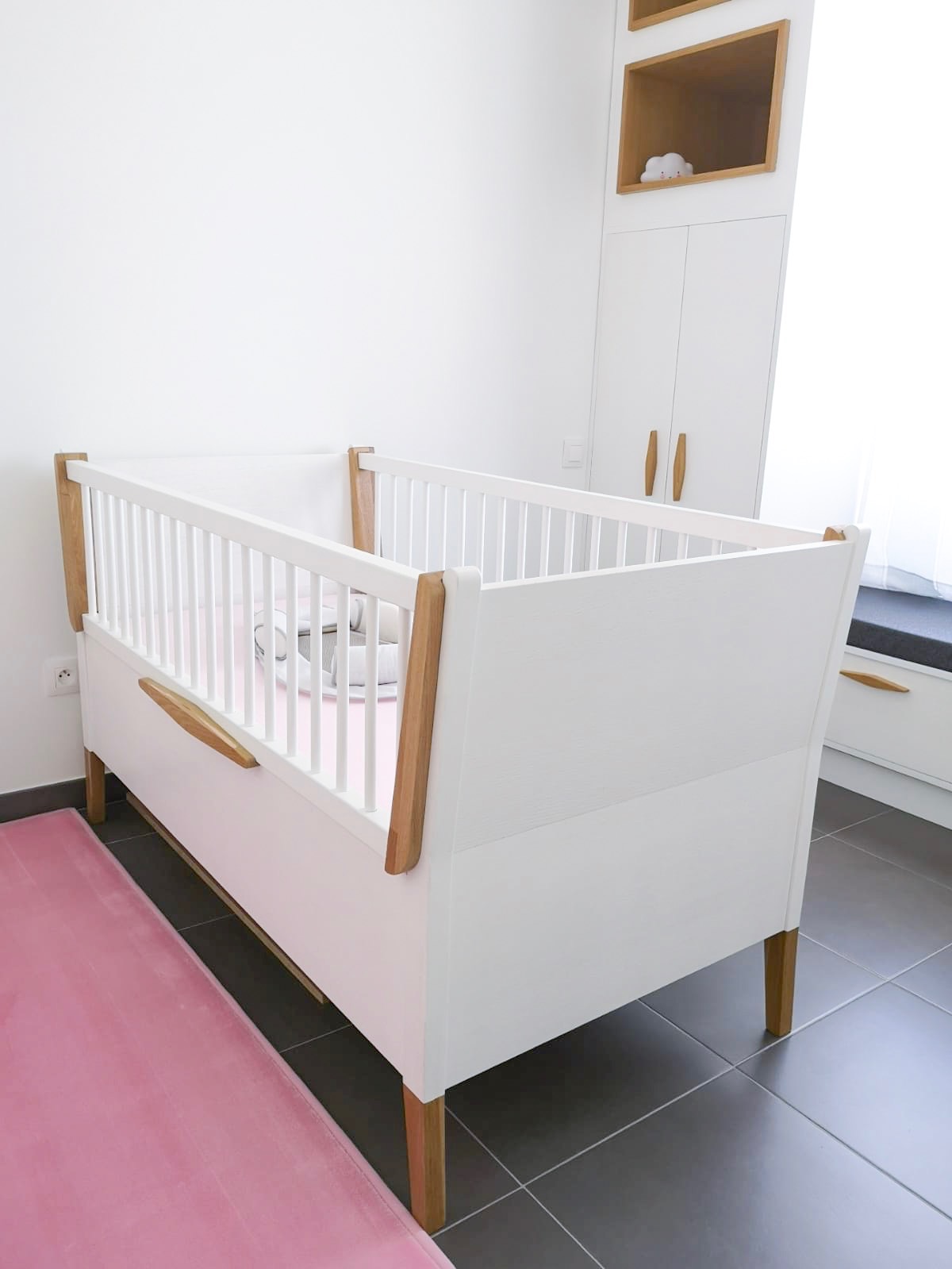 Le lit bébé est évolutif , une création originale en chêne peint en blanc et souligné par des décorations en chêne naturel.