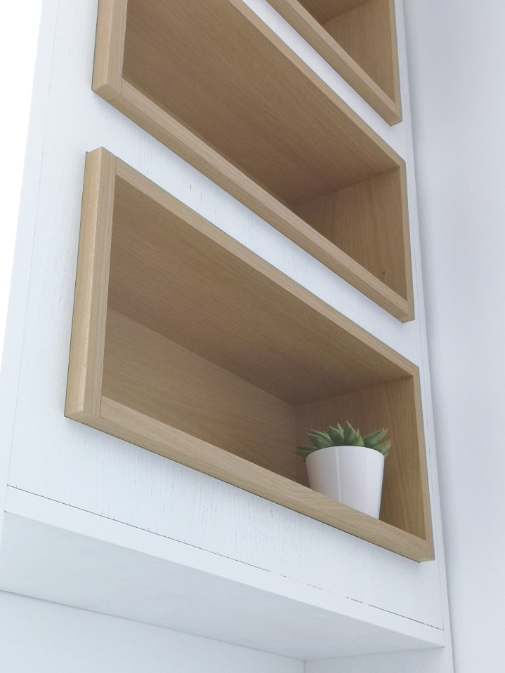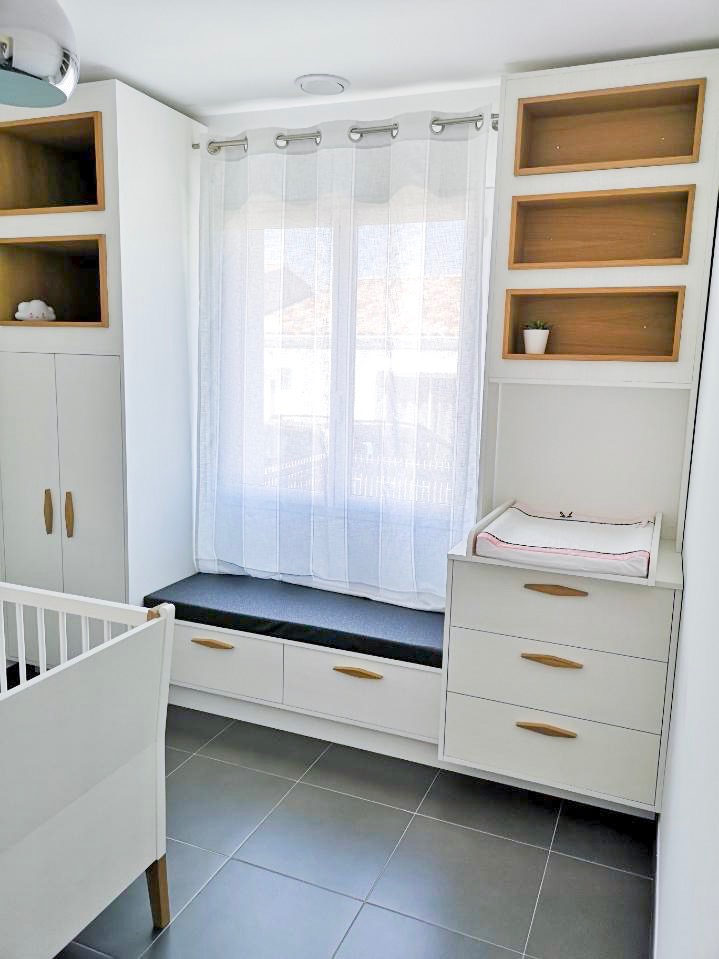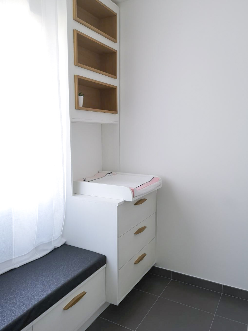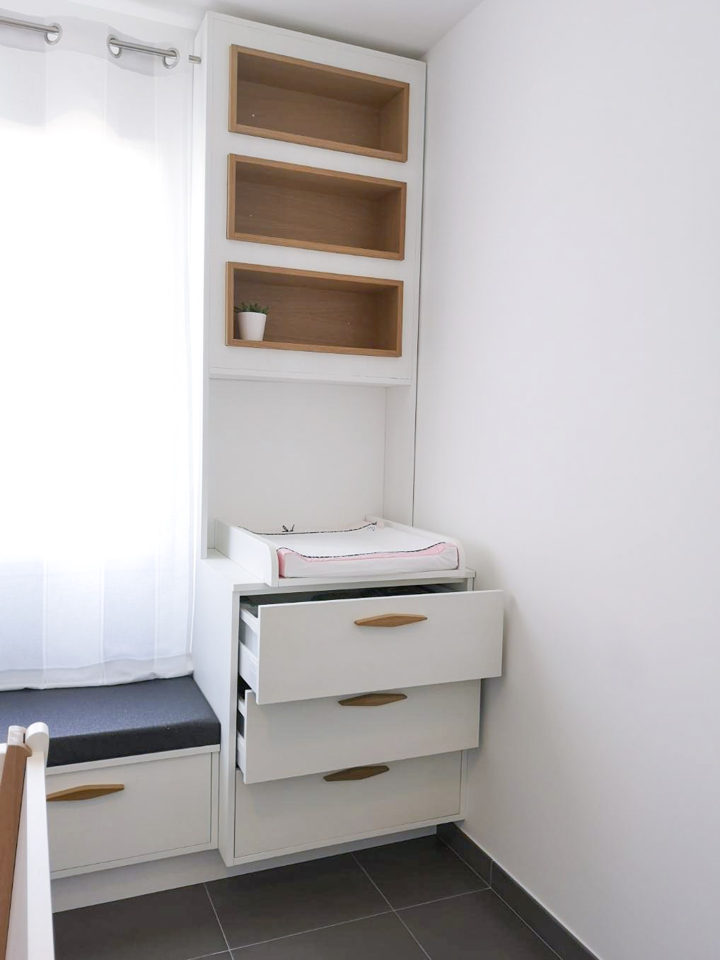 Idéal pour un petit intérieur ou bien pour un gain de place, ce dressing avec placard sur mesure est équipé d’une table à langer intégrée. Rangements et finitions en chêne naturel et structure en chêne naturel peint en blanc.