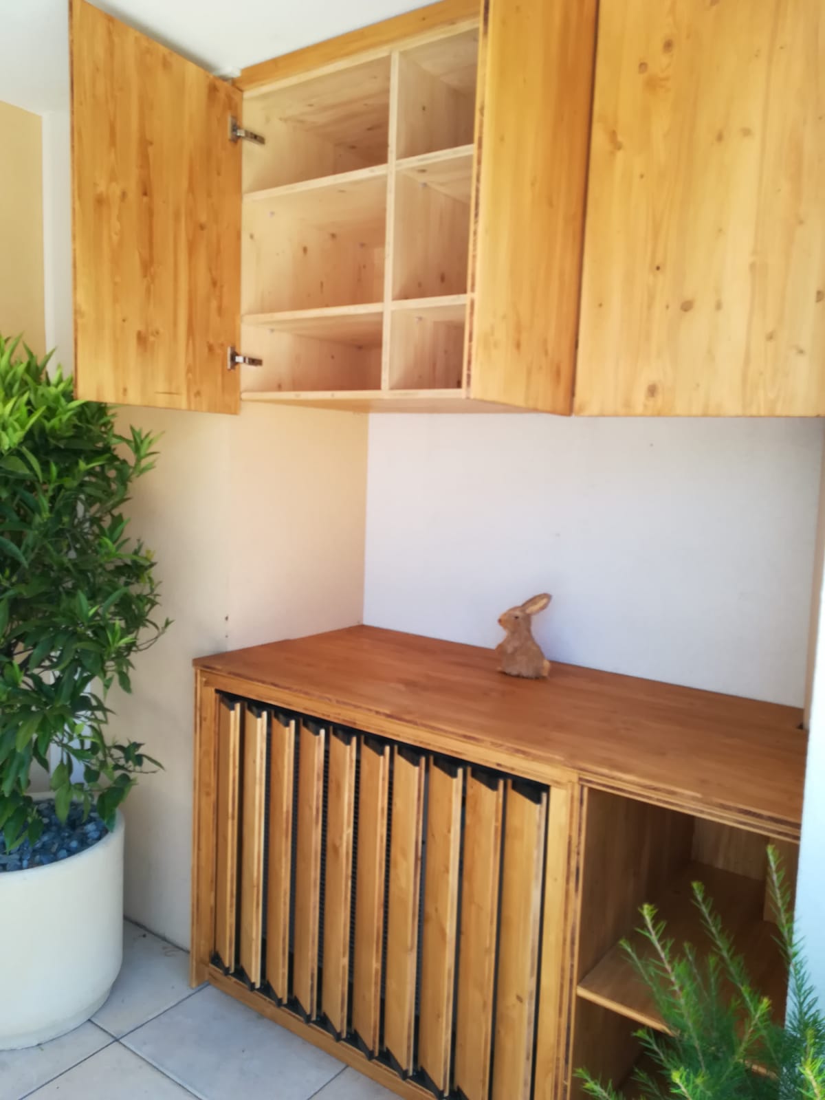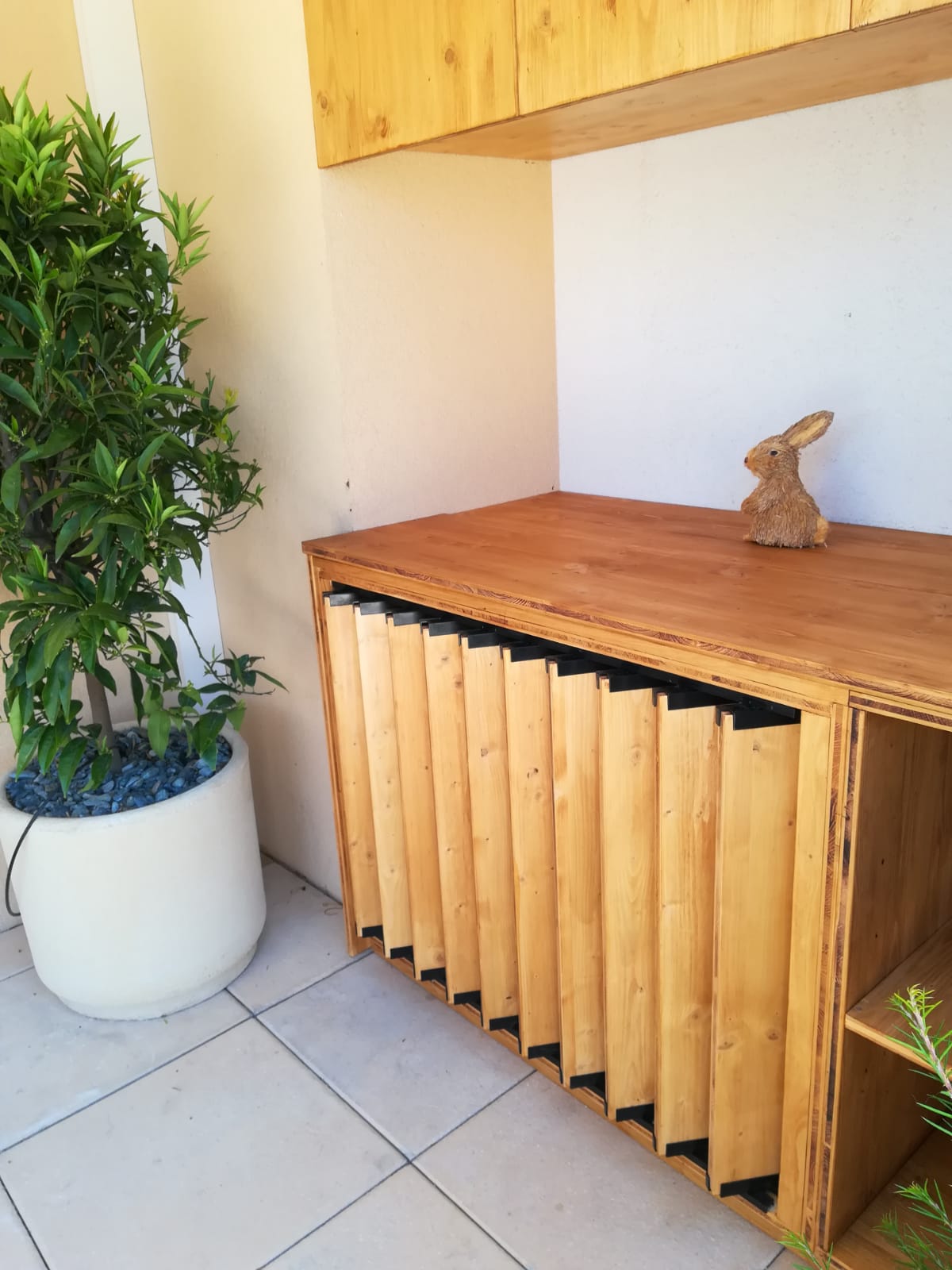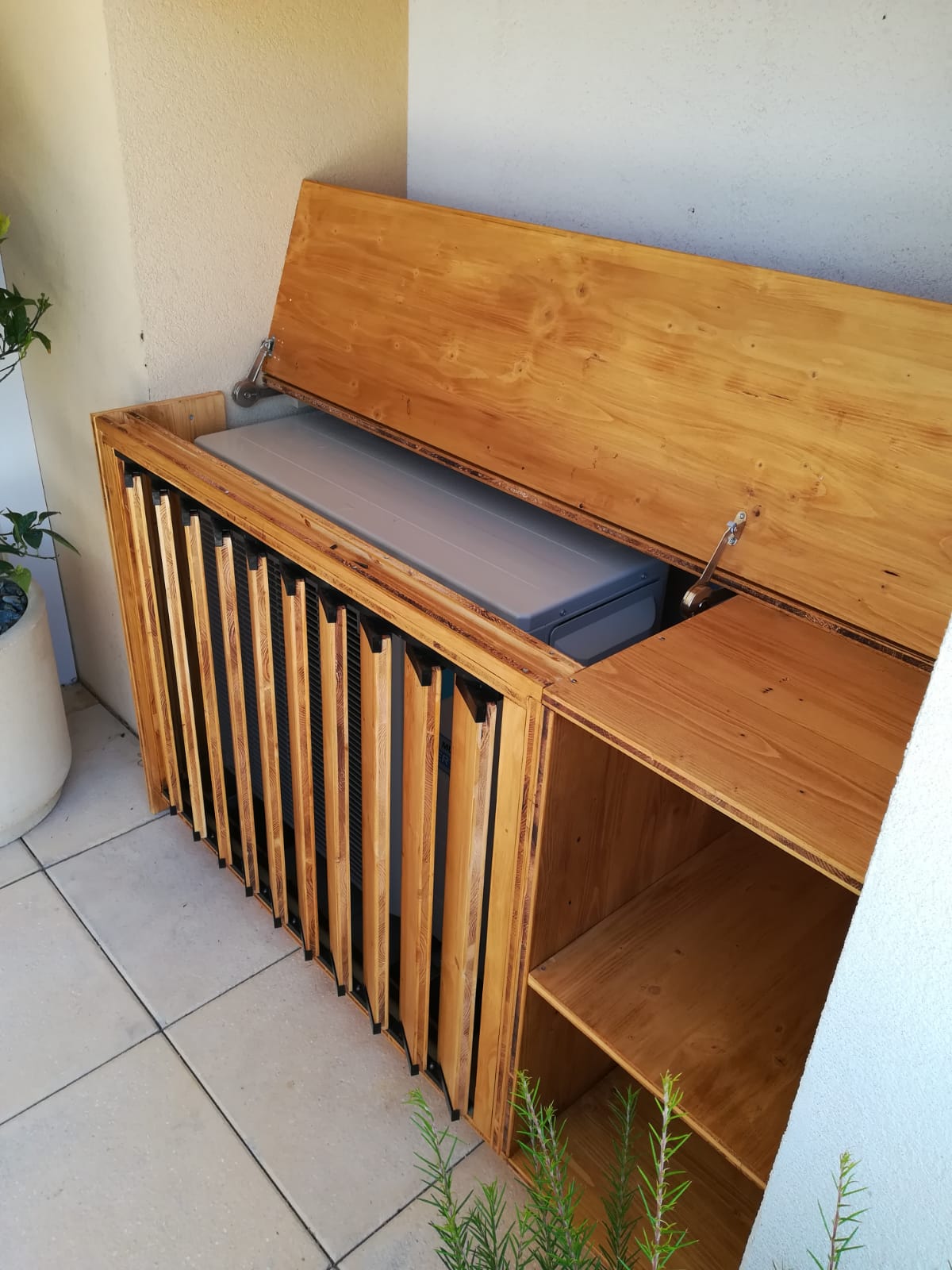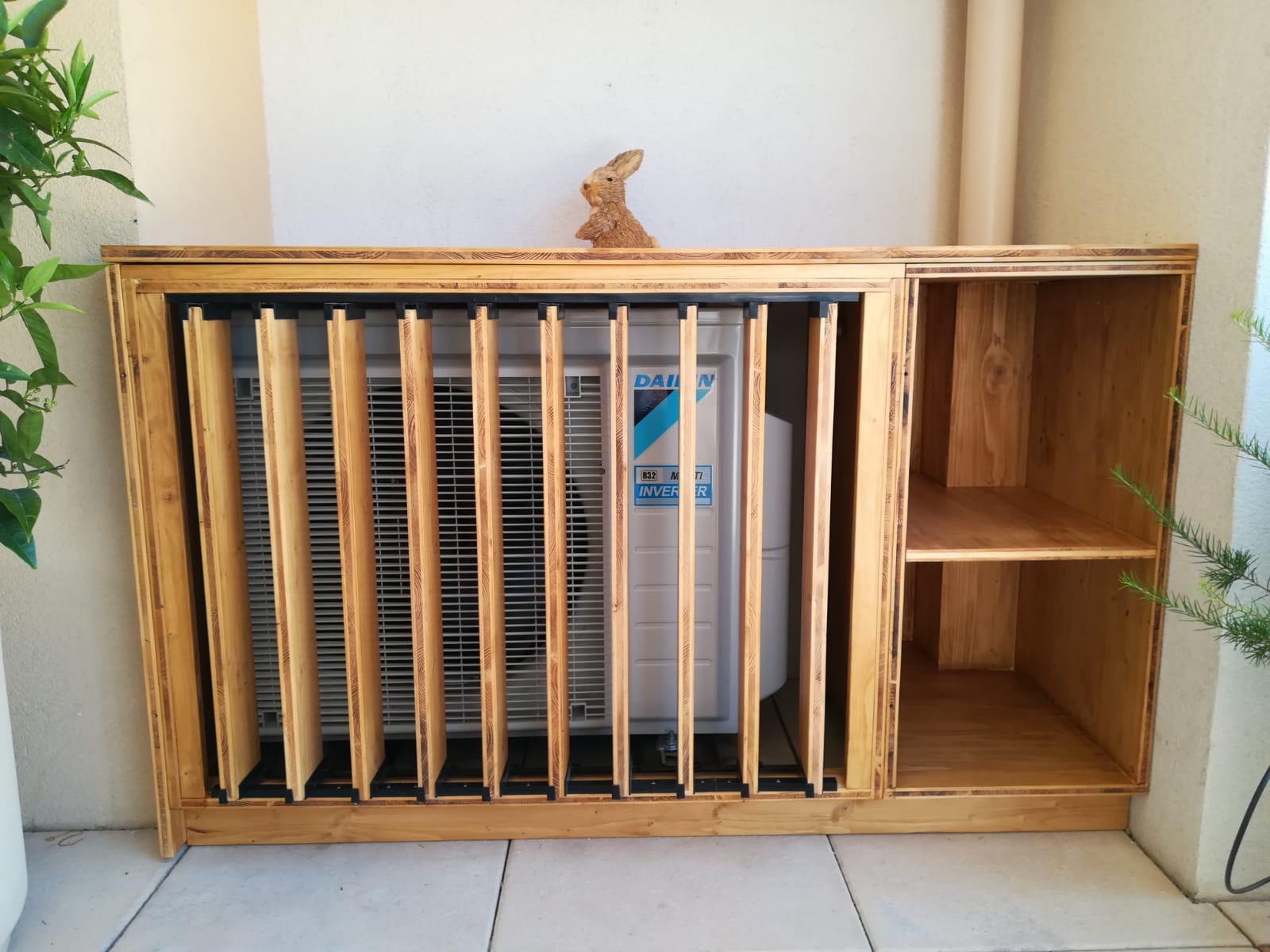 Ce meuble en pin dissimule un groupe de climatisation tout en proposant de nouveaux espaces de rangement ( placards haut et étagères ). Les lames verticales orientables permettent, en plus de camoufler l’installation, de diriger le flux d’air. Le plateau au-dessus se soulève pour accéder au groupe si besoin. Pour les finitions tout le meuble est lazuré.