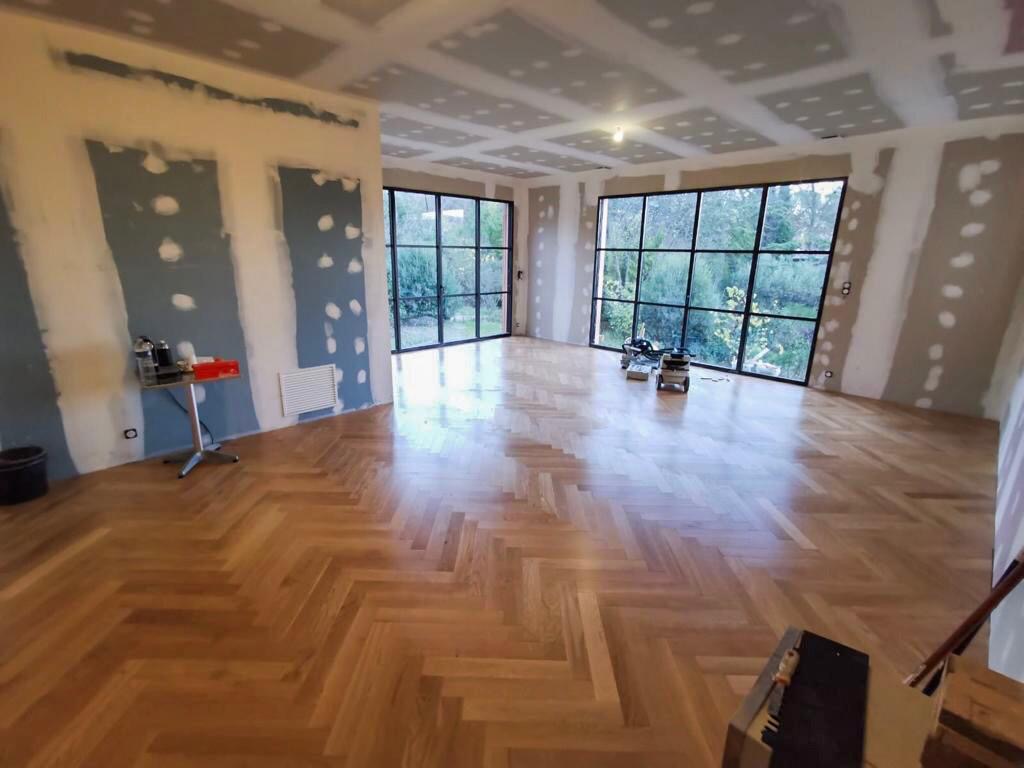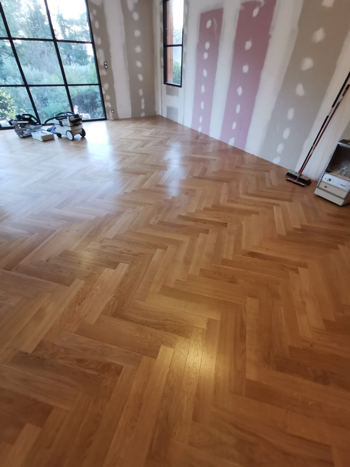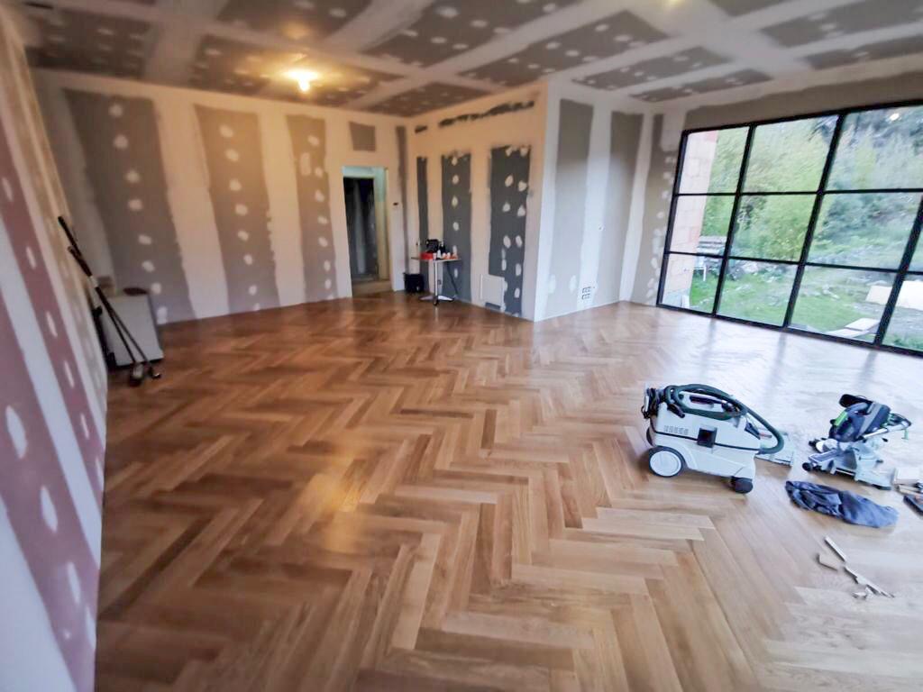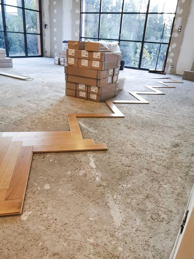 Un rendu original avec cette pose d’un parquet à bâton rompu contrecollé, parement chêne de 2,5 mm d’épaisseur. Il restera la pose des plinthes après peinture.