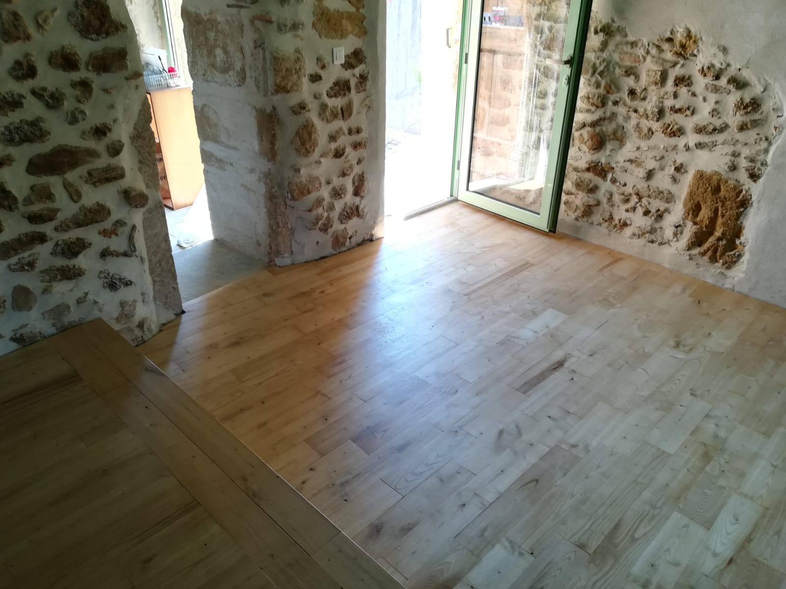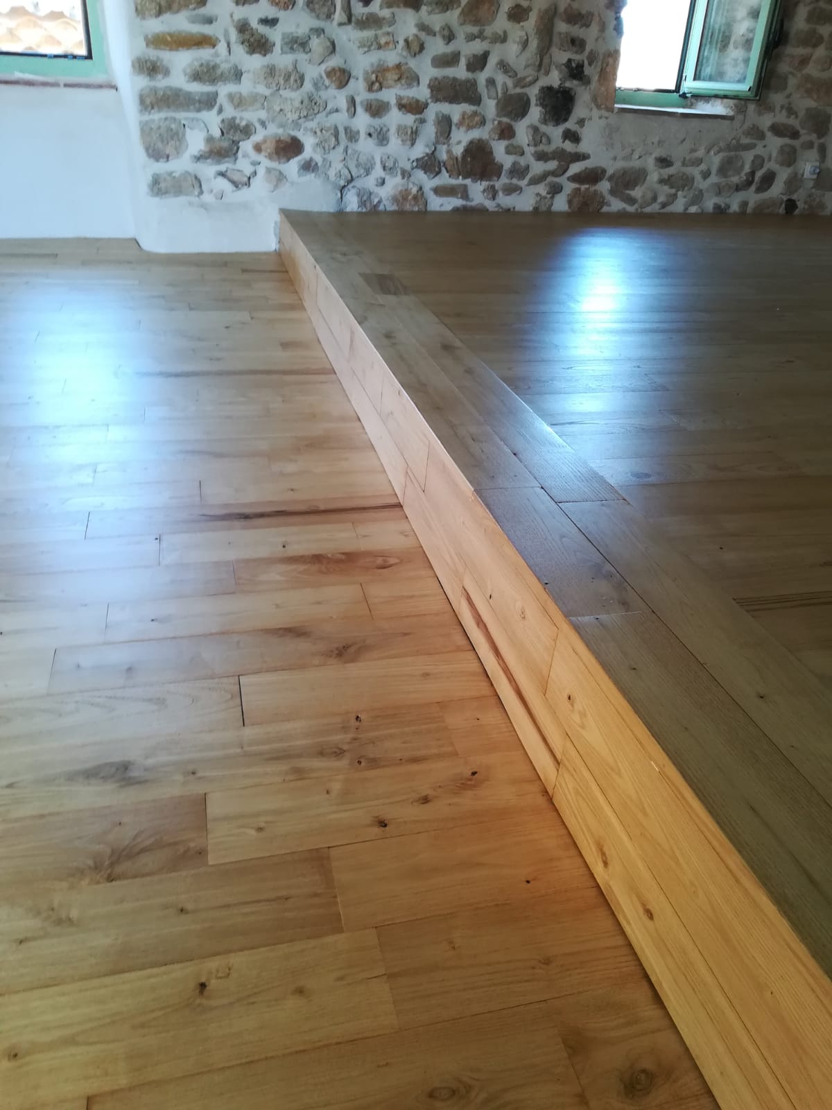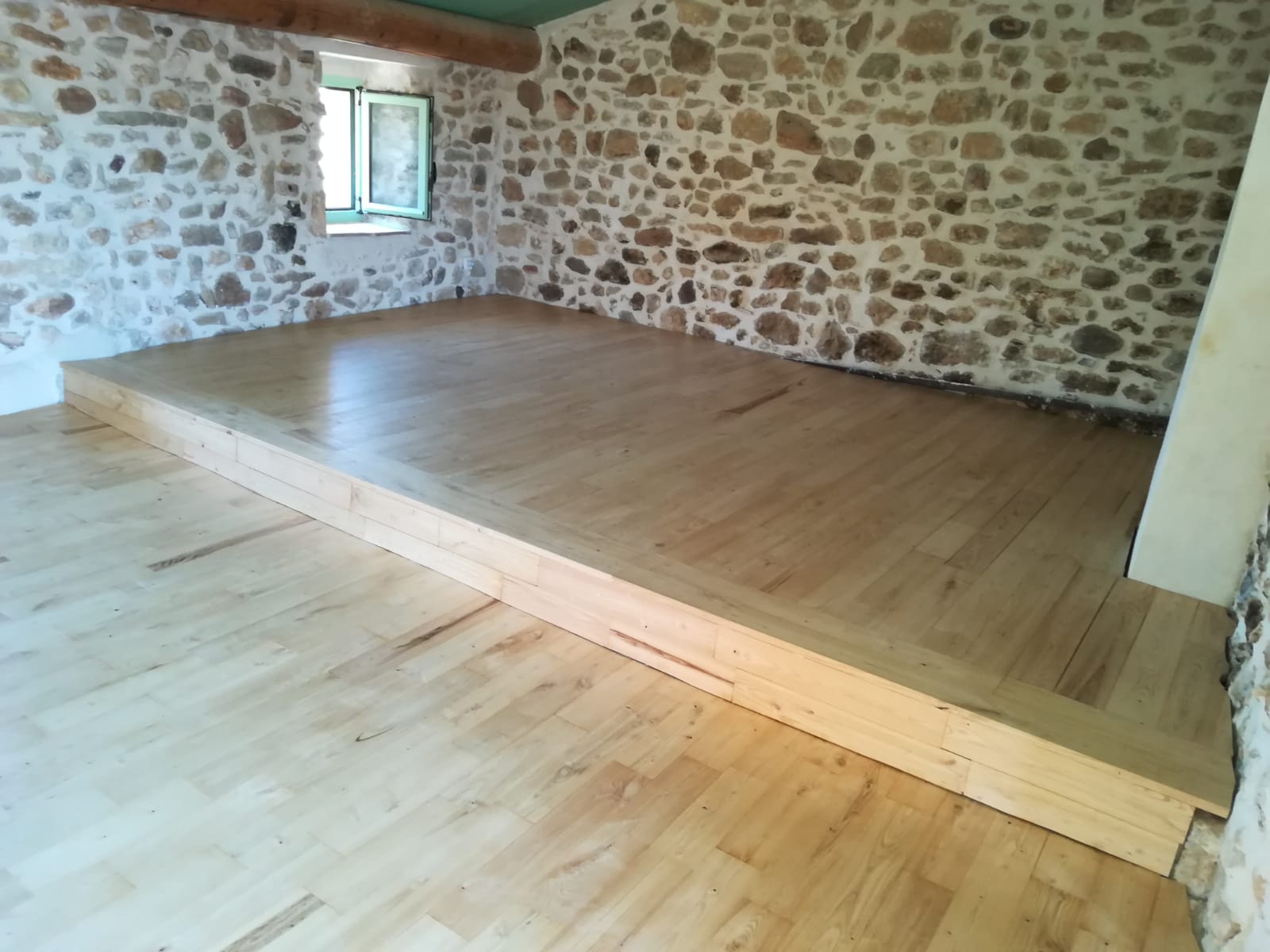 Avec cette nouvelle réalisation, un parquet massif en chataigner vient souligner de grands murs de pierre. La partie surélevée et posée sur plot et lambourdes (fixations clouées). La partie basse est, quand à elle, collée. Pour les finitions, application d’un vernis incolore mat