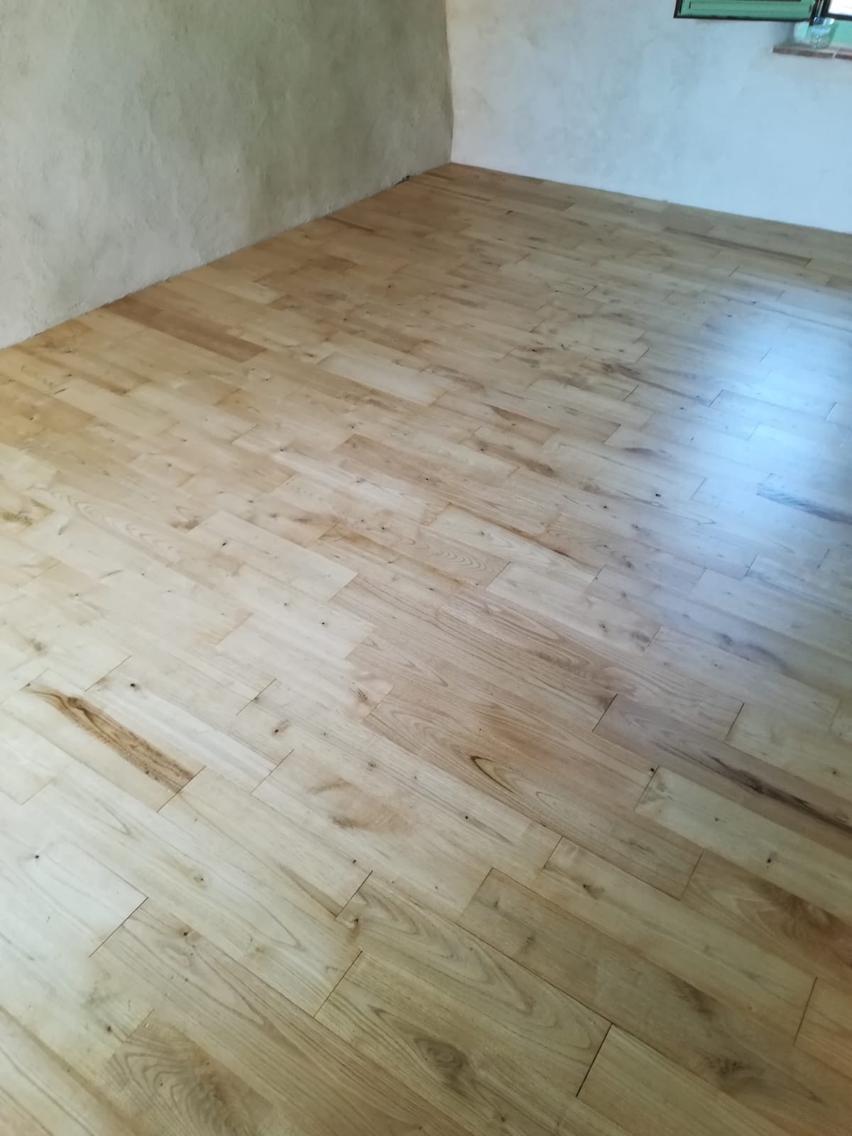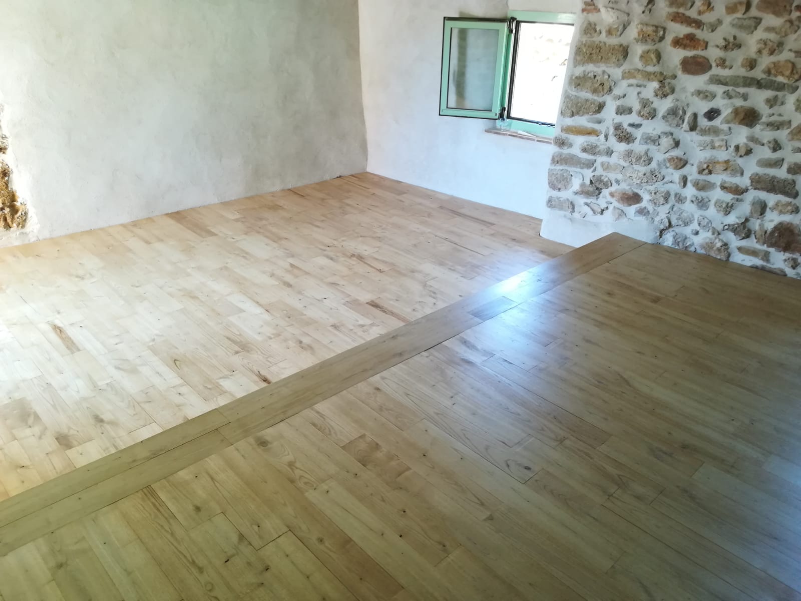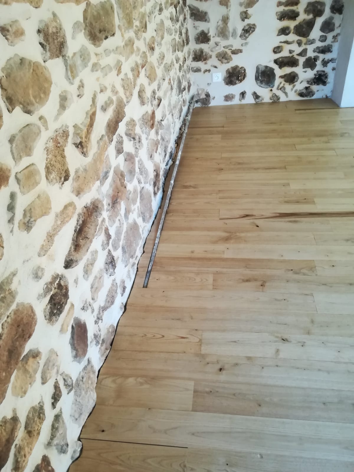 Avec cette nouvelle réalisation, un parquet massif en chataigner vient souligner de grands murs de pierre. La partie surélevée et posée sur plot et lambourdes (fixations clouées). La partie basse est, quand à elle, collée. Pour les finitions, application d’un vernis incolore mat
