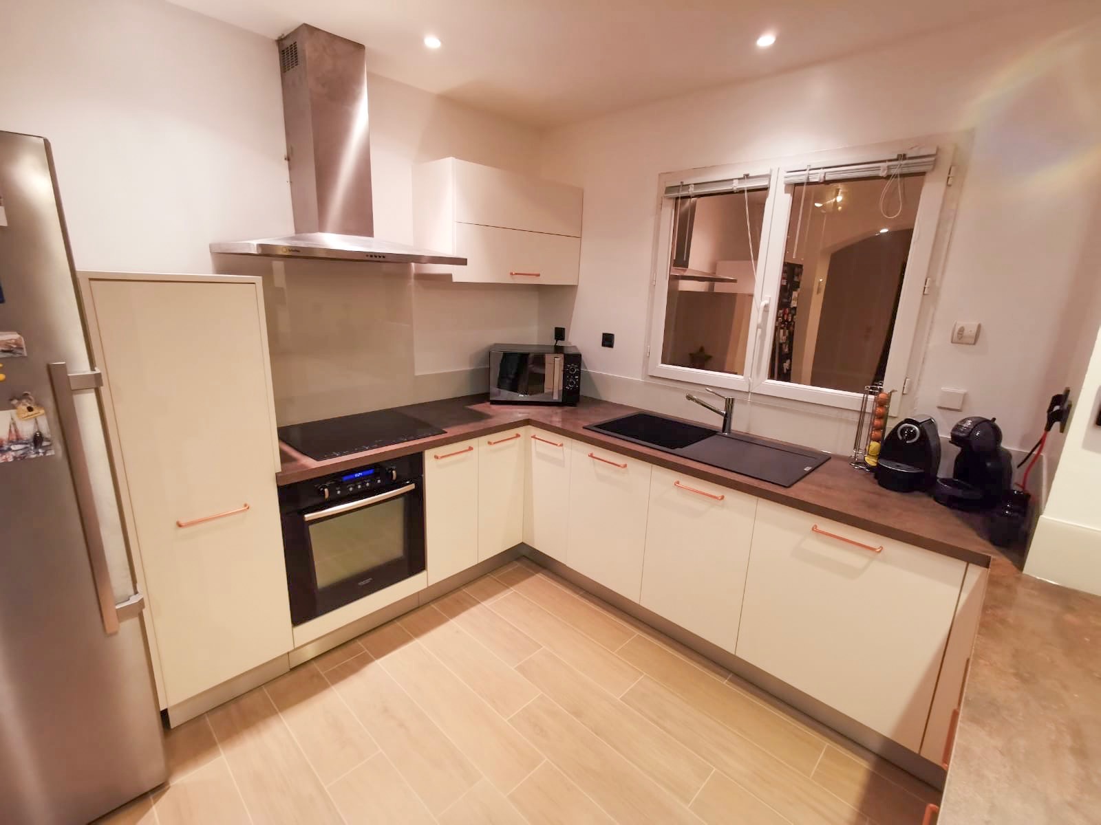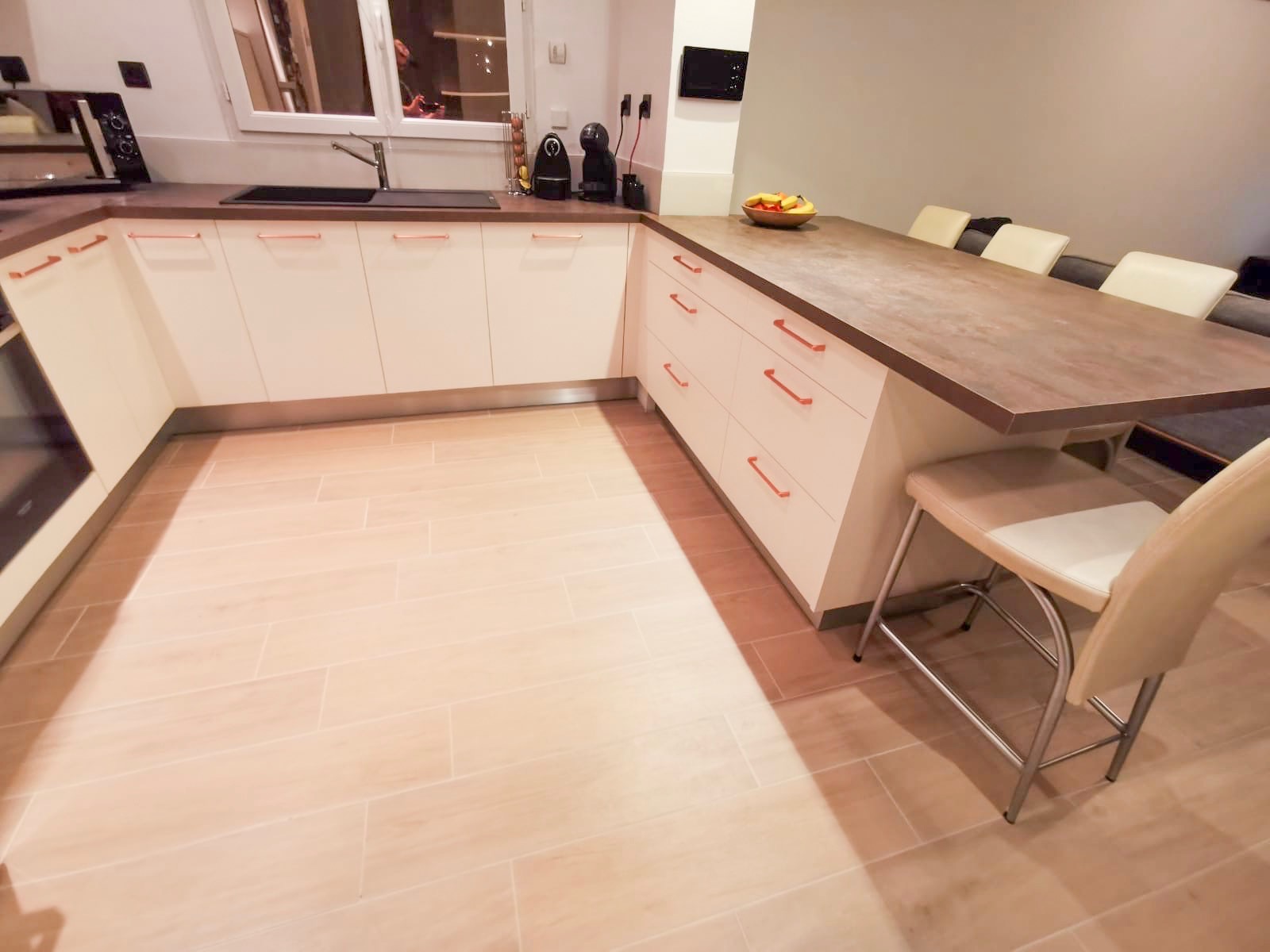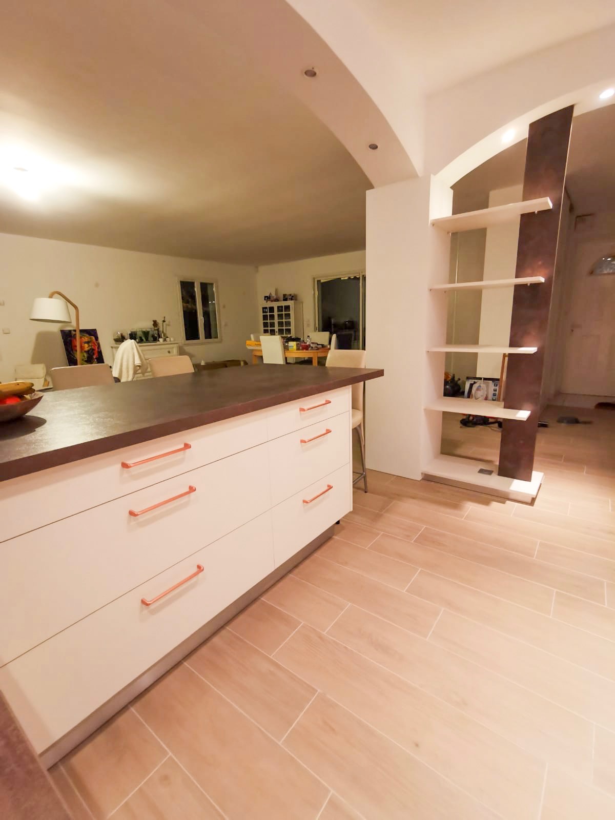 Pour moderniser ce lieu de vie, les façades, les poignées, le plan de travail, ainsi que l’évier ont été changé. Pour les finitions, une nouvelle crédence en verre, des plinthes en pvc décor alu, apportent désormais une touche plus moderne.