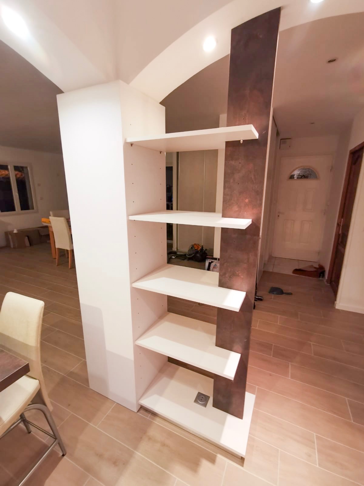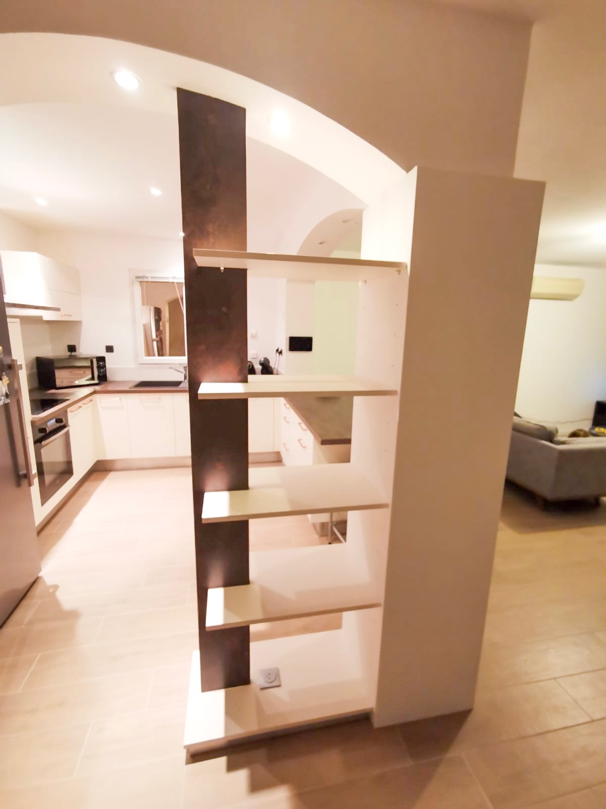 Avec la creation d’étagères au couleur de la cuisine. Ces tout nouveaux rangements sont fixés a un coffre en bois peint en blanc pour cacher l’ancienne decoration.