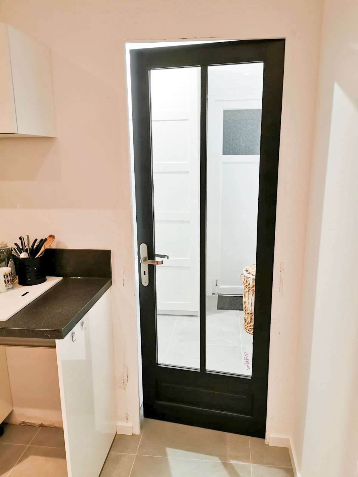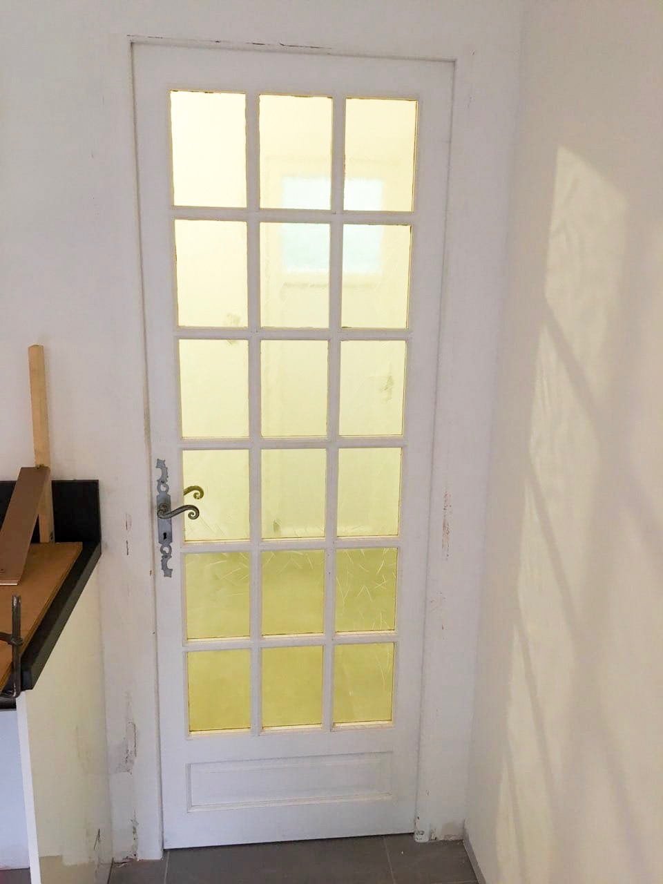 Les anciens carreaux ont été retirés, remplacés par un verre transparent. La porte a été peinte en noir. Désormais la piece est plus lumineuse grace à cette porte dans l’esprit verrière.